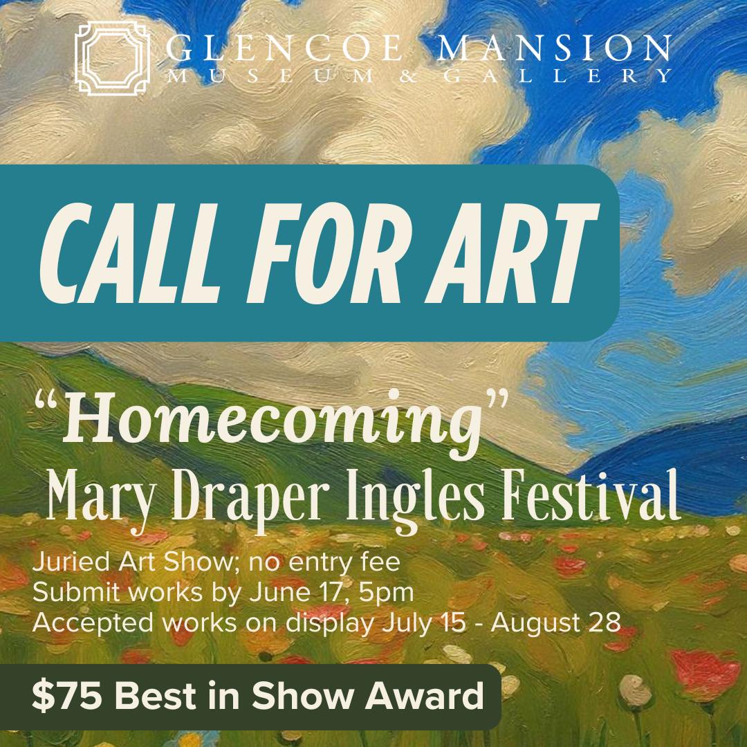 “Homecoming” will be on display July 15 - August 28 in the Glencoe Mansion Gallery. The Opening Reception, during which prizes will be announced, will take place on Friday July 24, from 5:30-7pm at Glencoe Mansion as part of the Mary Draper Ingles Festival.